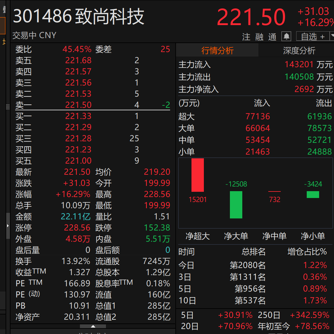 上证报中国证券网讯(记者 王玉晴)截至2月3日14时18分,致尚科技(301486)上涨16.29%,股价报221.50元/股,总市值285亿元。此外,光通信板块多股大涨,罗博特科(300757)20%涨停,天通股份(600330)、通宇通讯(002792)涨停。