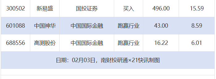 首次覆盖方面,2月3日券商共给出了7次首次覆盖,其中中国巨石(600176)获得国联民生(601456)证券给予“推荐”评级,欧莱新材获得东北证券给予“增持”评级,环旭电子(601231)获得甬兴证券给予“买入”评级,长白山(603099)获得华源证券给予“增持”评级,江西铜业(600362)获得开源证券给予“买入”评级。