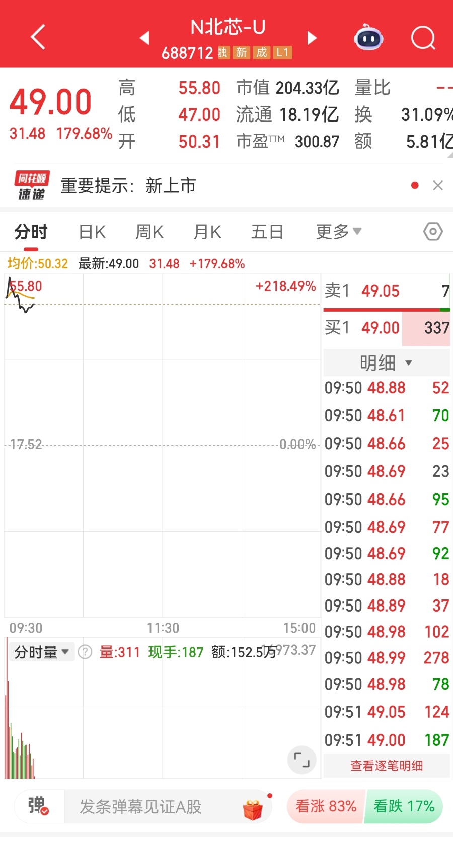 同花顺(300033)数据显示,北芯生命当天以50.31元/股高开,盘内涨幅一度超210%。截至发稿,公司市值约200亿元。