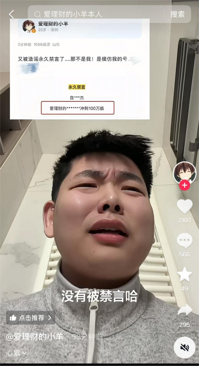 当日上午,“爱理财的小羊”在抖音上连发两条视频“辟谣”,称自己没有被禁言,被封的是一个模仿他的账号。