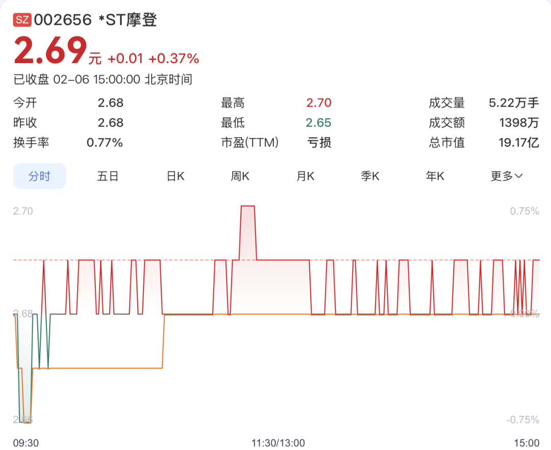二级市场方面,*ST摩登最新股价报2.69元/股,最新市值19.17亿元。