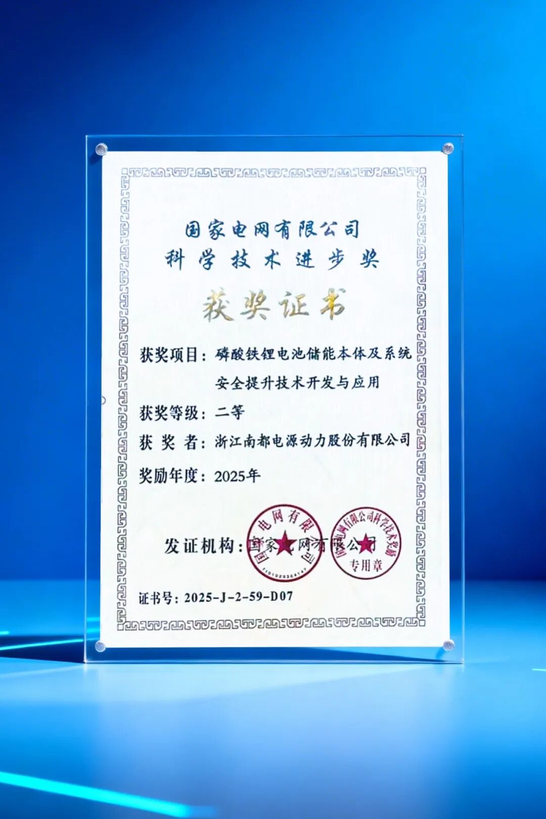 日前,南都电源(300068)参研的“磷酸铁锂电池储能本体及系统安全提升技术开发与应用” 项目,荣获国家电网有限公司 2025 年度科学技术进步二等奖。