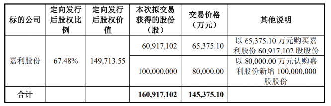 根据交易方案,得邦照明拟以6.54亿元向老股转让交易对方协议受让其所持有的嘉利股份6091.71万股股份,同时公司拟以8亿元认购嘉利股份新增股份1亿股,本次交易共计14.54亿元。交易完成后,得邦照明将持有嘉利股份1.61亿股股份,占嘉利股份总股本的67.48%。