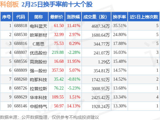 2月25日科创板换手率前十大个股,电科蓝天居首