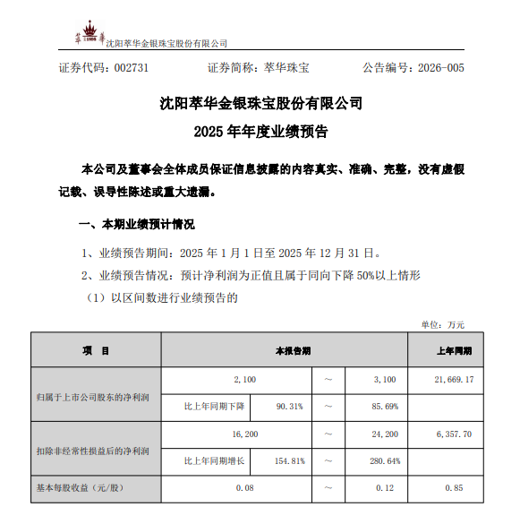 此外,ST萃华2025年年度业绩预告显示,公司预计2025年归母净利润2100万元至3100万元,同比下降85.69%-90.31%;扣非净利润预计1.62亿元至2.42亿元,同比增长154.81%-280.64%。而记者注意到,净利暴跌同公司2025年前三季度的数字存在“反差”。据其2025年三季报,公司归母净利为6310.62万元,同比增长48.97%。
