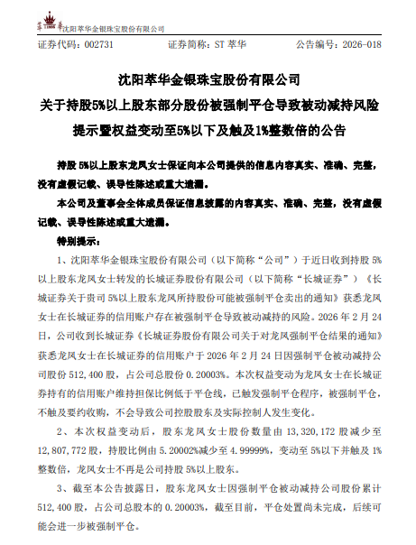 2月24日,ST萃华(002731)(002731)连发两份公告,其两大股东遭强平。持股5%以上股东深圳翠艺及其一致行动人郭英杰、股东龙凤相继因强制平仓被动减持股份,合计减持超145万股。