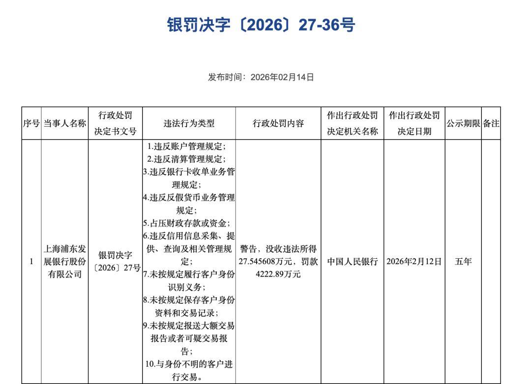 据央行官网披露的行政处罚公示,对上海浦东发展银行的处罚原因包括:违反账户管理规定;违反清算管理规定;违反银行卡收单业务管理规定;违反反假货币业务管理规定;占压财政存款或资金;违反信用信息采集、提供、查询及相关管理规定;未按规定履行客户身份识别义务;未按规定保存客户身份资料和交易记录;未按规定报送大额交易报告或者可疑交易报告;与身份不明的客户进行交易等十项违法行为。