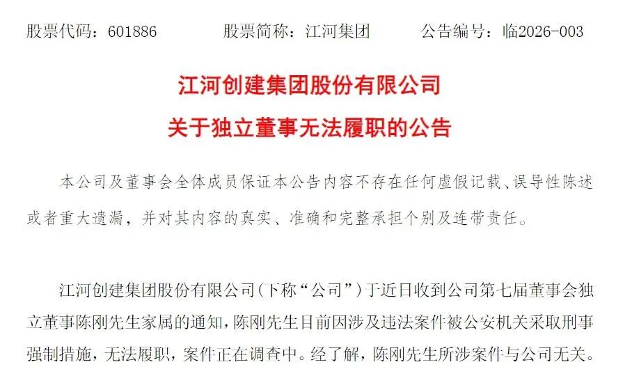 2026年2月26日晚间,江河集团(601886)(601886)发布公告披露,公司近日收到第七届董事会独立董事陈刚家属的通知,陈刚因涉及违法案件被公安机关采取刑事强制措施,目前已无法履行独立董事职责,相关案件正处于调查阶段,具体案件细节尚未对外披露。