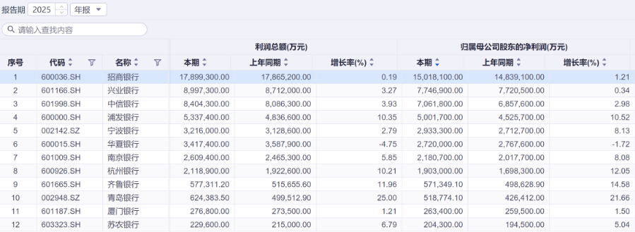截至2月26日,共有12家A股上市银行披露了2025年的成绩单,涉及5家股份行、6家城商行(884251)、1家农商行(884252)。除了华夏银行(600015)之外,其余11家银行的归母净利润增速全部实现正增长,有四家银行甚至实现两位数的增长,其中青岛银行(002948)的增速最快,达到了21.66%。