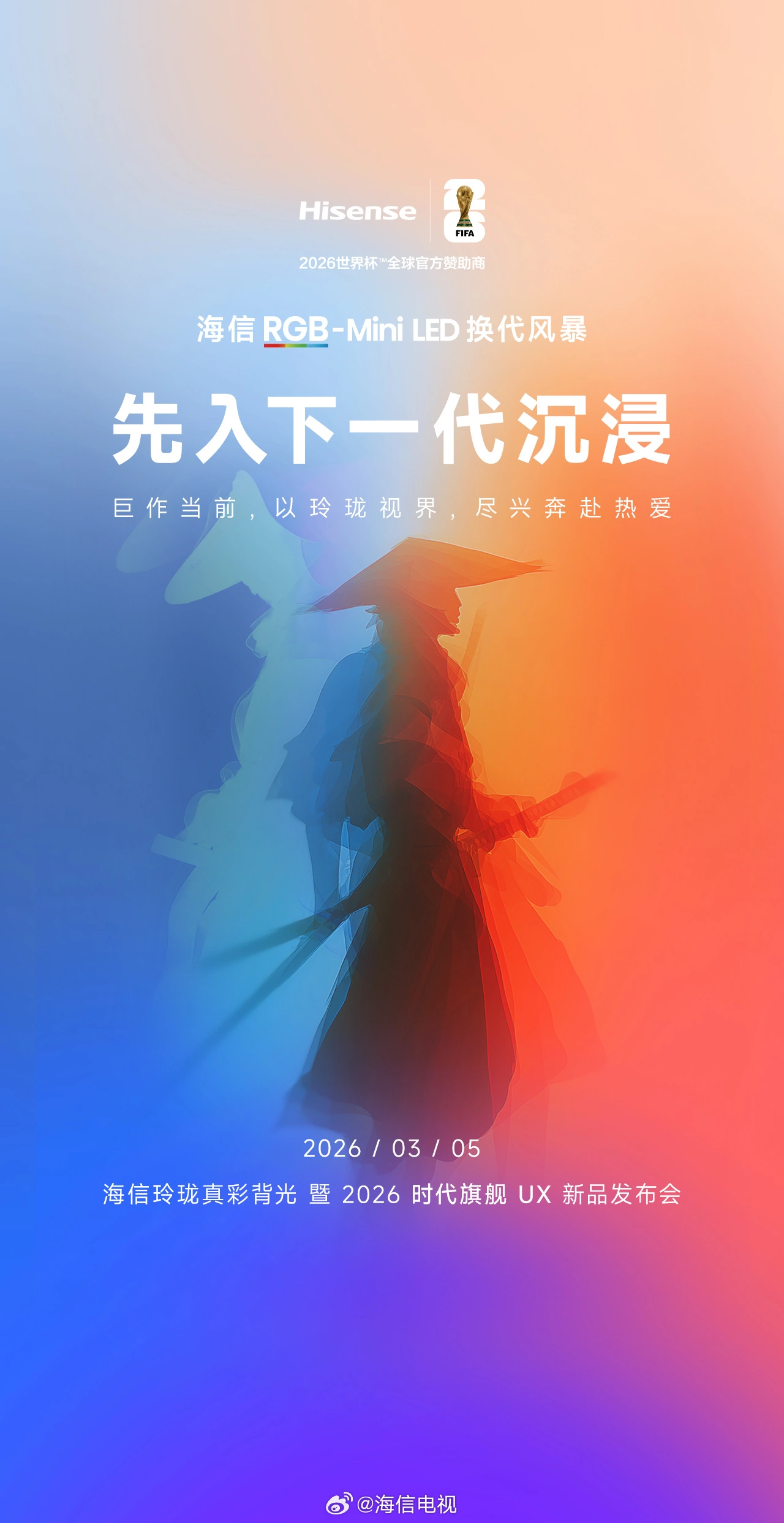 IT之家2月28日消息,海信RGB-Mini LED(884095)超旗舰电视UX2026款官宣将于3月5日正式发布上市,全球首创海信玲珑四芯真彩背光。
