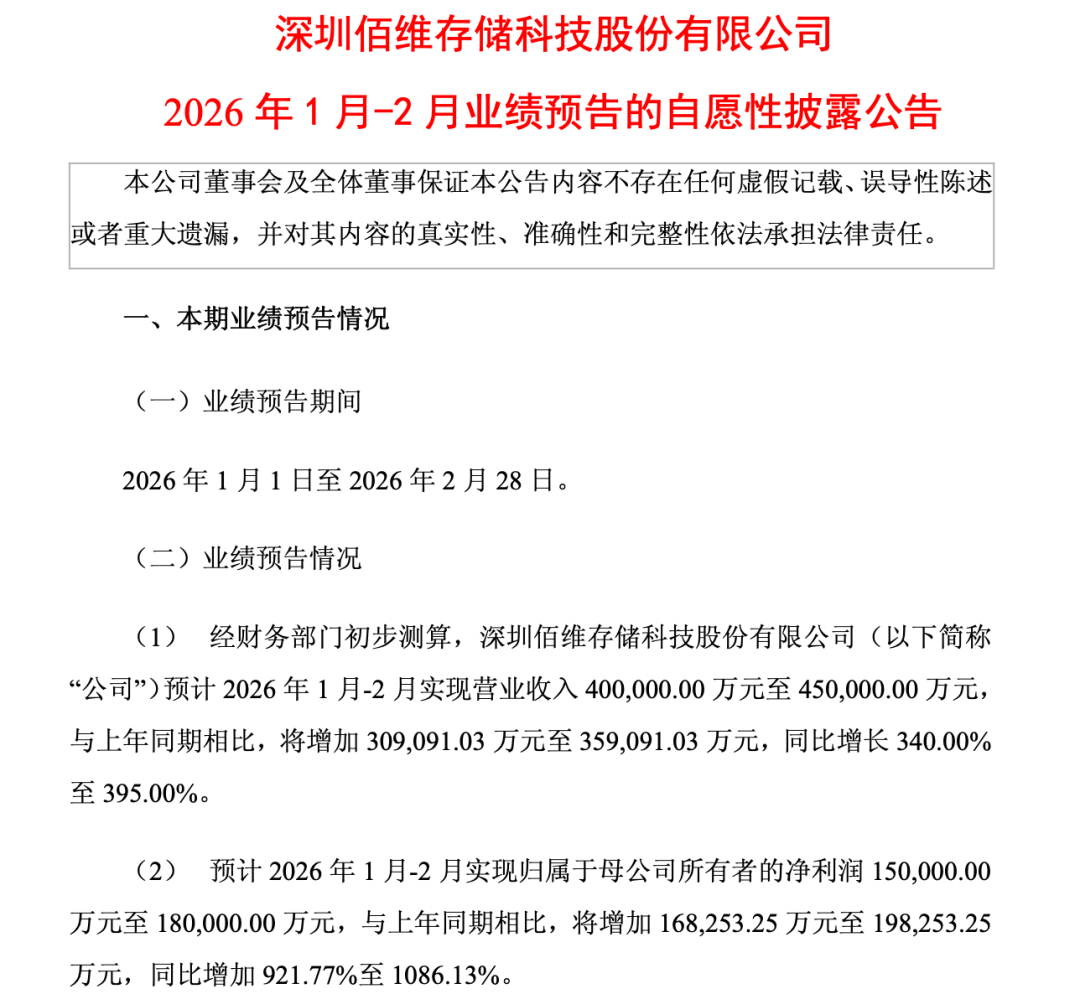 3月3日晚间,佰维存储(688525)(688525)发布业绩预告:公司预计2026年1—2月实现营业收入40亿元至45亿元,同比增长340%至395%;归属于上市公司股东的净利润为15亿元至18亿元,同比扭亏为盈。