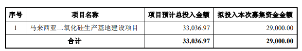 本次发行可转债募集资金总额(含发行费用)不超过人民币29,000万元(含本数),扣除发行费用后的募集资金净额将用于马来西亚二氧化硅生产基地建设项目。