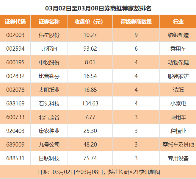 从券商推荐家数来看,3月2日至3月8日有176家上市公司得到券商推荐,其中伟星股份(002003)获得9家推荐,比亚迪(002594)获得6家推荐,中牧股份(600195)等获得4家推荐。