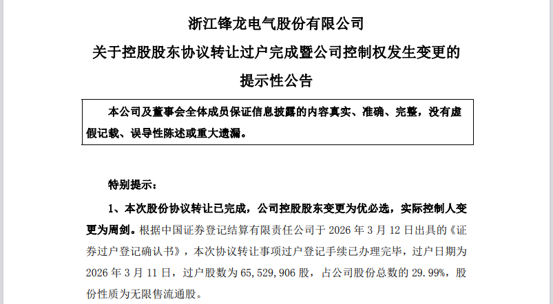 易主落地!锋龙股份股价涨停