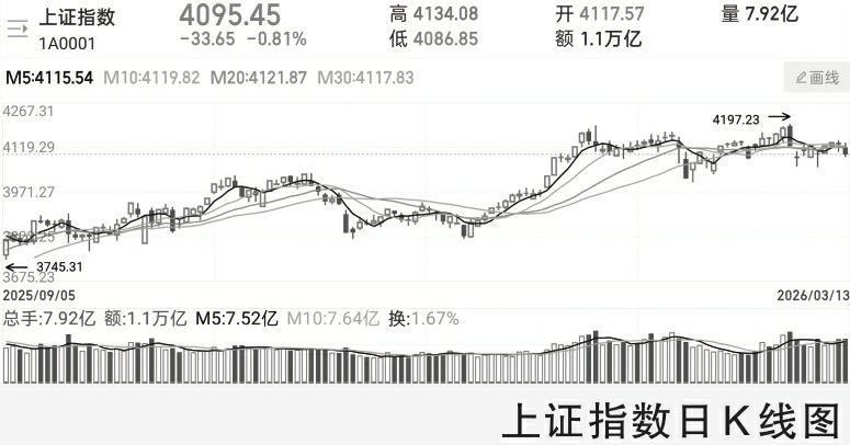 从目前看,中东局势的后续演变,对全球金融市场仍有重大影响。若能早日结束冲突,重回航运畅通,那么对全球股市显然是利好;反之,则不确定性将会延续。其次,从A股自身看,表现总体稳定,抗跌性偏强,上证指数(1A0001)始终保持在4000点上方运行,除科创50(1B0688)外,其余指数均在箱体上边线附近运行,属于强方位置,显示投资者对后市预期仍偏正面。其三,随着重要会议结束,政策预期将暂告段落,市场关注点将回到上市公司年报和基本面。