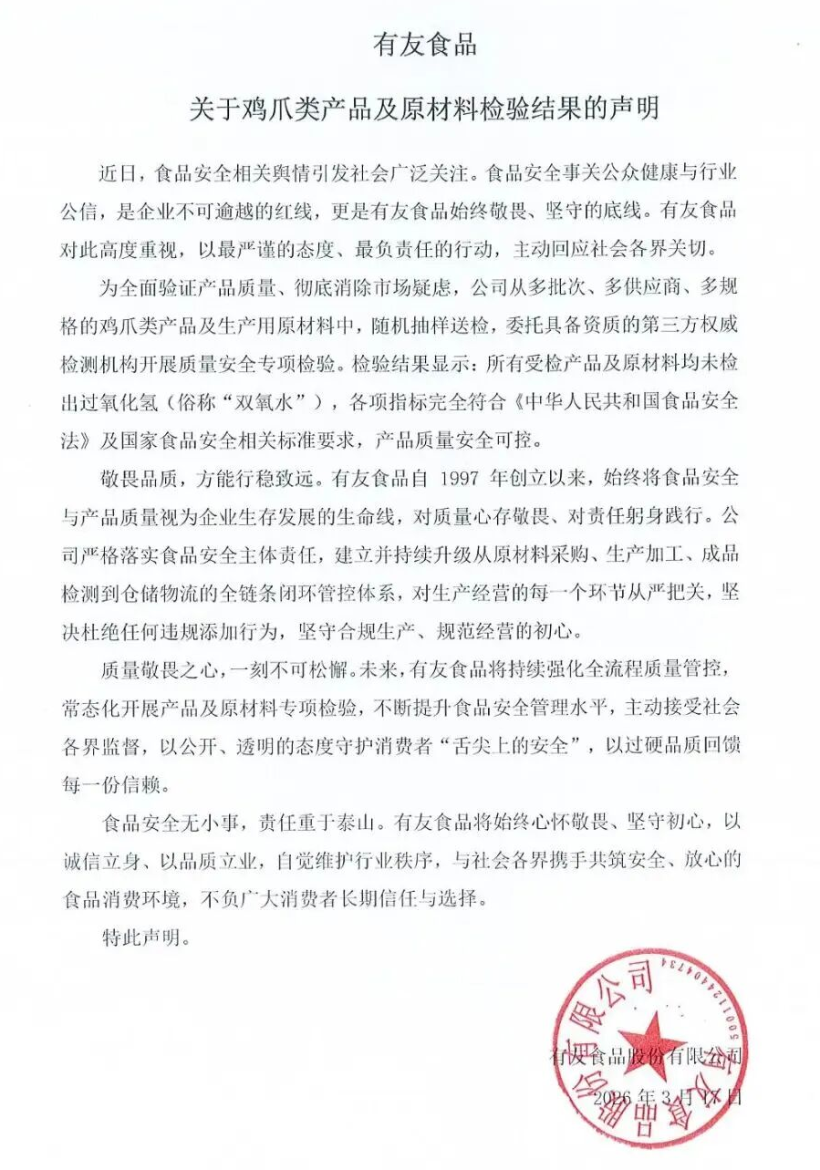 声明中,有友食品(603697)称,公司从多批次、多供应商、多规格的鸡爪类产品及生产用原材料中,随机抽样送检,委托具备资质的第三方权威检测机构开展质量安全专项检验。