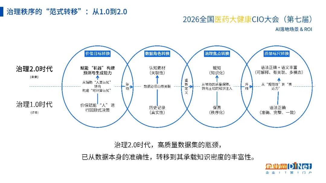 如何跨越这道数据鸿沟?焦烈焱点出,破局的关键在于认知升级:数据治理的本质,是避免数据世界走向混乱无序。他强调,当前数据治理秩序正经历从1.0到2.0的“范式转移”。面对激增的研发文献、临床报告等半结构化与非结构化数据,高质量数据集的瓶颈,已从过去单纯追求数据的“准确性”,转移到了其承载“知识密度的丰富性”上。这种对高知识密度的要求,彻底击穿了传统依靠人力、见效慢的治理模式。