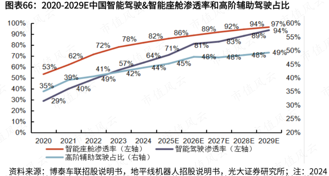 根据同行博泰车联(HK2889)(2889.HK)招股书数据,截至2024年,国内智能驾驶的渗透率约为57%,智能座舱(886059)的渗透率约为78%。