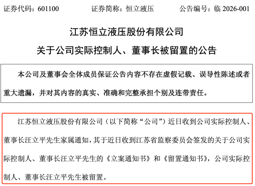 今日,A股液压龙头恒立液压(601100)公告称,公司近日收到实际控制人、董事长汪立平家属通知,其收到江苏省监察委员会签发的《立案通知书》和《留置通知书》,汪立平被留置。