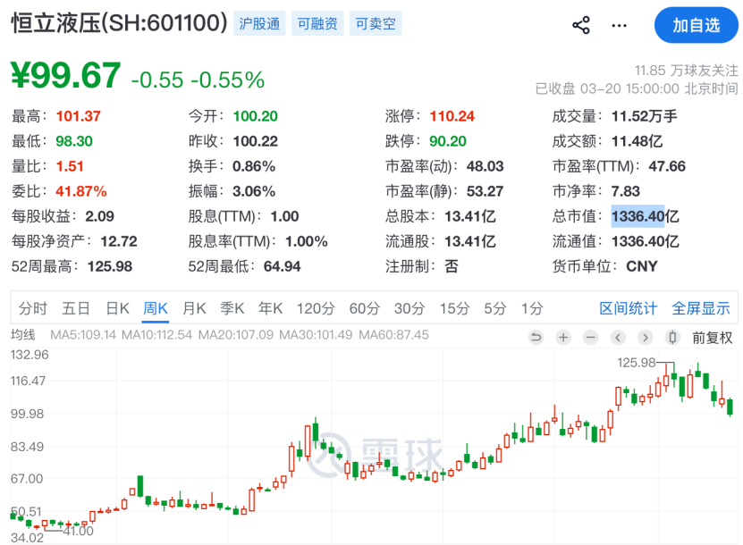 从股价表现来看,恒立液压(601100)是A股大牛股,今年1月公司股价一度飙涨至125.98元/股,相较于2024年7月的低点,累计涨幅达207%。但自2026年2月11日以来,恒立液压(601100)股价持续调整,截至最新收盘,报99.67元,总市值报1336.4亿元。