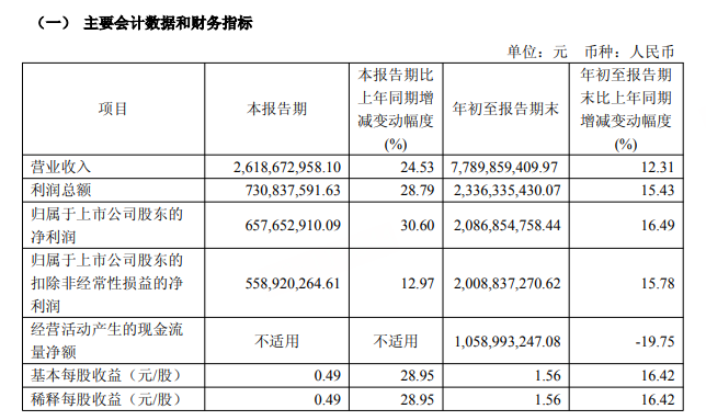 业绩方面,据公司此前披露的2025年第三季度报告,公司前三季度实现营收77.9亿元,同比增长12.31%;归母净利润20.87亿元,同比增长16.49%;扣非净利润20.09亿元,同比增长15.78%。毛利率、净利率分别为41.96%、26.85%。