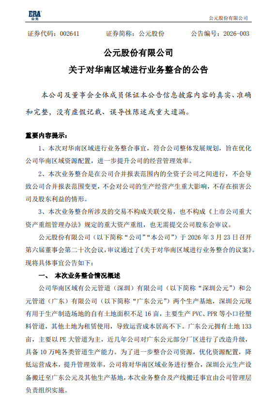 3月23日电,公元股份(002641)3月23日公告,公司华南区域有深圳公元和广东公元两个生产基地,深圳公元现有用于生产制造场地的自有土地面积不足16亩,主要生产PVC、PPR等小口径塑料管道,其他土地为租赁使用,导致运营成本居高不下。广东公元拥有土地133亩,主要以PE大管道为主,近几年公司对广东公元部分厂区进行了改造升级,具备10万吨各类管道生产能力。为了进一步整合公司资源,提升管理效率,公司将对华南区域业务进行整合,深圳公元生产设备搬迁至广东公元及其他生产基地。此次搬迁相关工作将产生搬迁运费、调试费、员工安置费等费用支出预计约3000万元—3500万元。