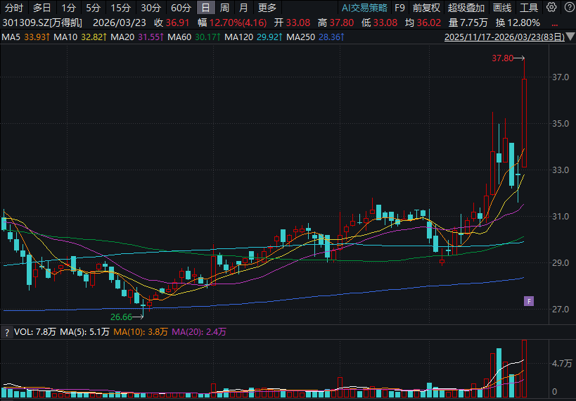 3月23日万得凯(301309)股价高开高走,日内上涨12.7%,收于36.91元/股,盘中股价创历史新高(883911)。