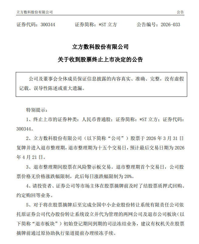 3月23日,*ST立方(300344)公告称,公司于2026年3月23日收到深交所《关于立方数科股份有限公司股票终止上市的决定》,深圳证券交易所决定终止公司股票上市交易。公司股票自2026年3月31日起复牌并进入退市整理期,预计最后交易日为2026年4月21日。