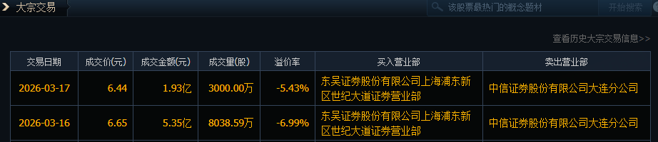 据大宗交易数据,3月16日至17日,南山铝业(600219)大宗交易卖方均为中信证券(600030)大连分公司,买方均为东吴证券(601555)上海浦东新区世纪大道营业部。3月16日成交8038.59万股,成交金额5.35亿元;3月17日成交3000万股,成交金额1.93亿元。以此计算,怡力电业本次减持套现超7.2亿元。