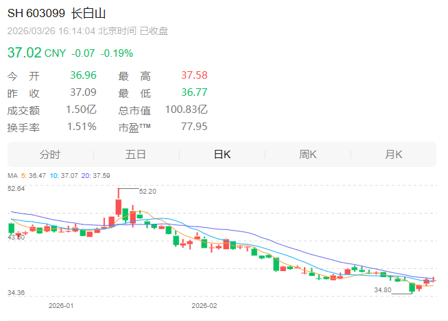 截至26日收盘,长白山(603099)报37.02元/股,总市值100.83亿元。