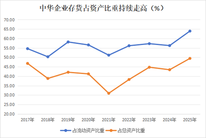 同时,公司的存货持续位于高位,2025年存货总额为272亿元,相比2024年年末增长25.3亿元,占流动资产、总资产比重分别为63.94%、49.45%,均创2017年以来9年新高。存货去化缓慢,资金沉淀严重,在房地产(881153)行业调整的当下,资产减值风险陡增。此外,公司应收账款从2024年年末3.12亿元增至2025年年末3.45亿元,虽增幅不大,但金额却创出历史新高,在行业回款压力下,坏账风险有所上升。