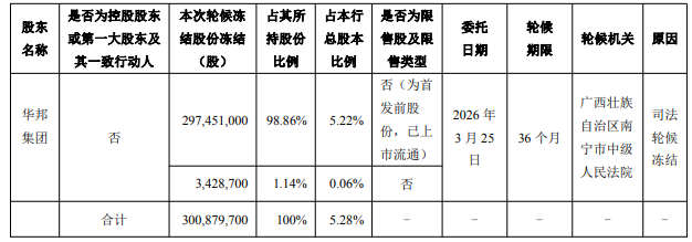华邦集团本次轮候冻结股份合计30087.97万股,占其所持股份的100%,占兰州银行(001227)总股本的5.28%。委托日期为2026年3月25日,轮候期限为36个月,轮候机关为广西壮族自治区南宁市中级人民法院。
