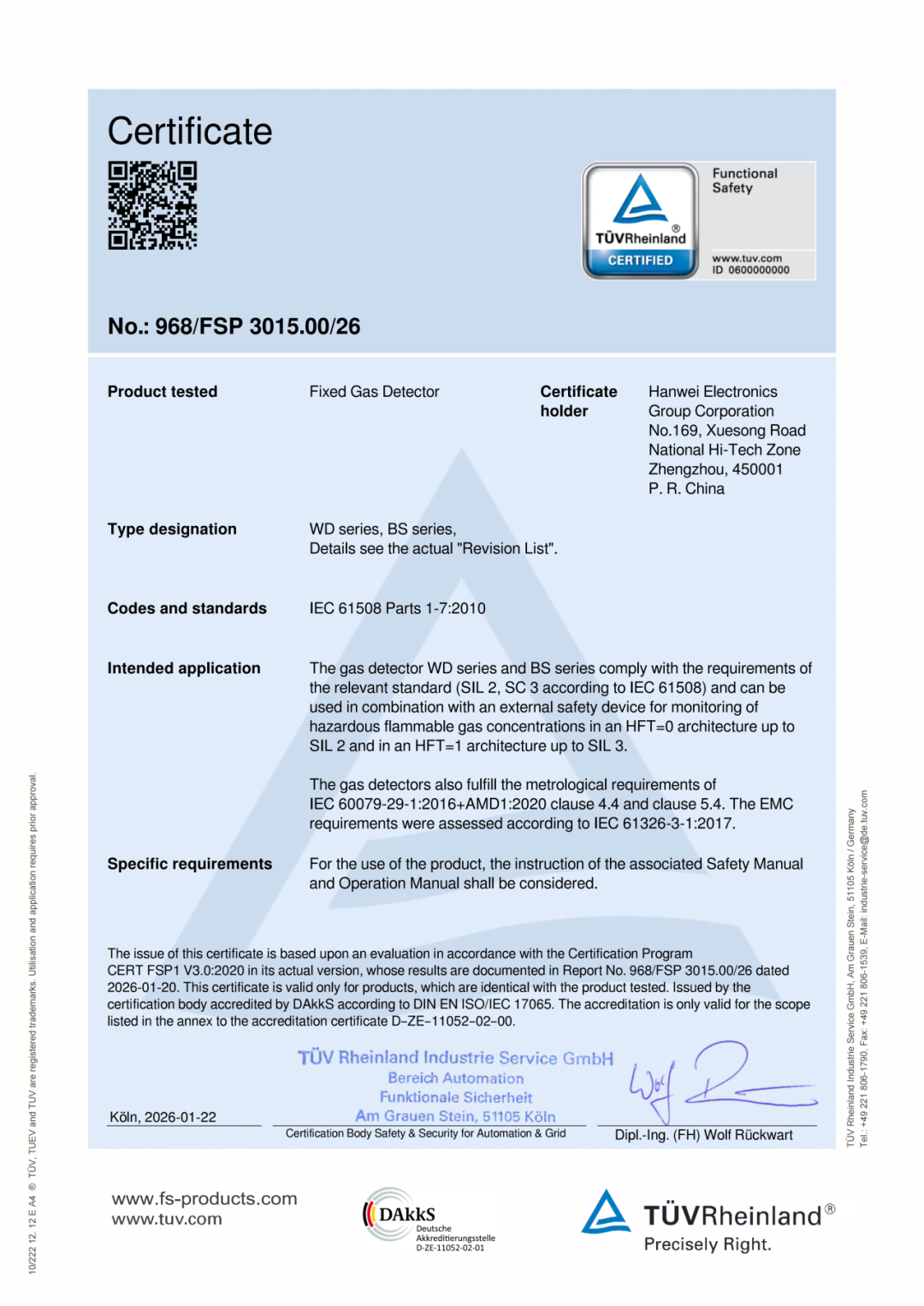 德国莱茵T V作为全球权威的第三方检测认证机构,具有国际公认的严苛标准与专业公信力,其认证标识是产品通行全球的品质通行证。此次获得T V莱茵认证标志着汉威科技(300007)集团成为中国本土气体探测行业首家获得德国莱茵T V功能安全认证的制造商,也是目前中国本土企业中唯一一家同时获得德国莱茵T V功能安全(SIL2)认证与防爆认证(ATEX/IECEx)的气体探测器企业。