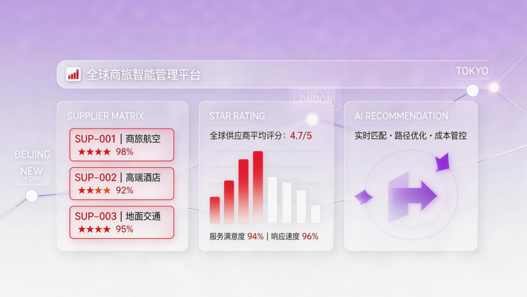 依托本体标准化定义商旅供应商的属性、服务标准、考核指标等核心要素,打造商旅供应商全生命周期(883436)智能管理体系。基于本体标准为企业智能推荐匹配差标、消费(883434)场景的优质协议供应商,从源头降低采购成本;实时监控供应商履约情况,对服务异常、价格偏离等问题自动预警,保障服务价值;按本体化考核体系完成供应商多维度智能评价,为采购谈判、供应商汰换提供科学依据,持续挖掘资源端长期合作价值。