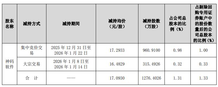 2025年12月31日至2026年1月22日,神码软件共计减持1276.4026万股,减持均价17.0930元/股。经计算,神码软件减持套现金额为2.18亿元。
