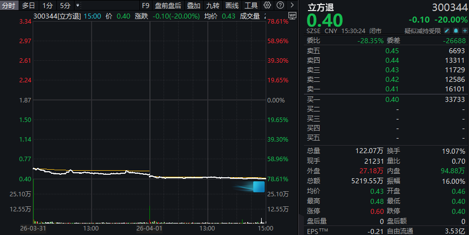 进入退市整理期第二个交易日,立方退(300344)(300344)股价继续承压,以“20CM”跌停成为今日全市场跌幅最大的个股。数据显示,自进入退市整理期以来,该股股价两日内累计下跌78.61%。据公司此前公告,退市整理期为十五个交易日。