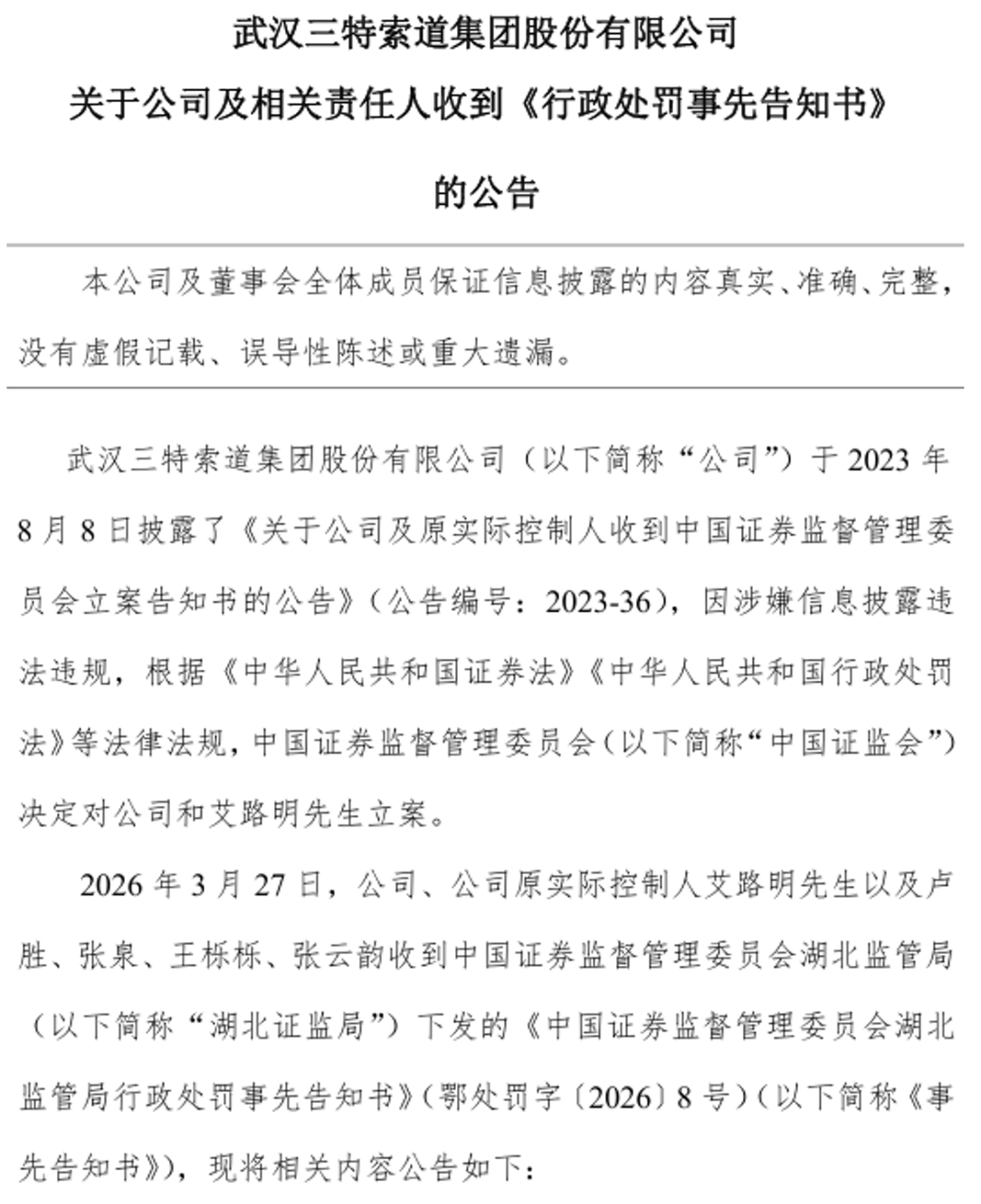 2023年8月,三特索道(002159)及原实际控制人艾路明收到证监会立案告知书,因涉嫌信息披露违法违规被启动调查。在历经两年多的全面核查后,湖北证监局最终出具了《行政处罚事先告知书》,为这起信披违规及资金占用案给出明确调查结论与拟处罚意见。