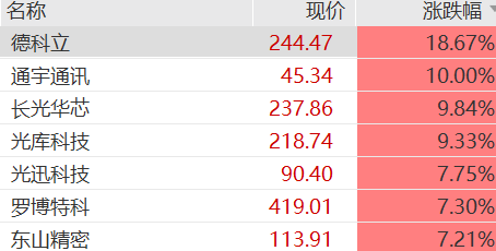 上涨方面,CPO强势领涨,德科立(688205)涨超18%,长光华芯(688048)、通宇通讯(002792)涨停。