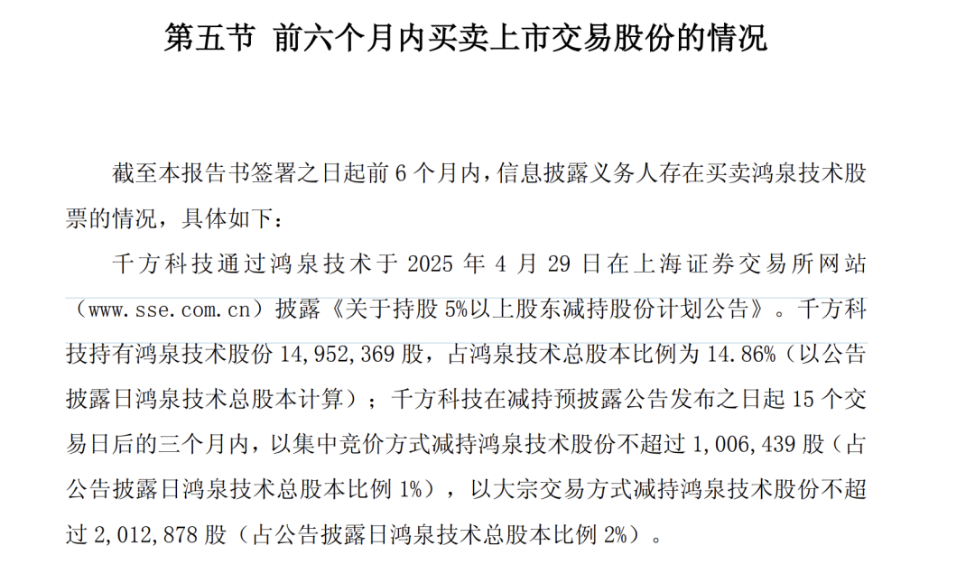 记者注意到,自2025年以来,千方科技(002373)已经多次减持鸿泉技术(688288)股份。根据鸿泉技术(688288)于2025年4月29日披露的公告,千方科技(002373)持有鸿泉技术(688288)股份1495.24万股,占鸿泉技术(688288)总股本比例为14.86%(以公告披露日鸿泉技术(688288)总股本计算)。根据最新公告,千方科技(002373)目前持有鸿泉技术(688288)9.99%股份。