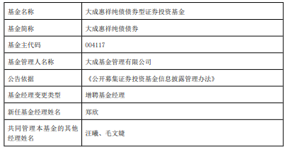 中国经济网北京4月7日讯近日,大成基金公告,大成惠祥纯债债券(004117)增聘郑欣。