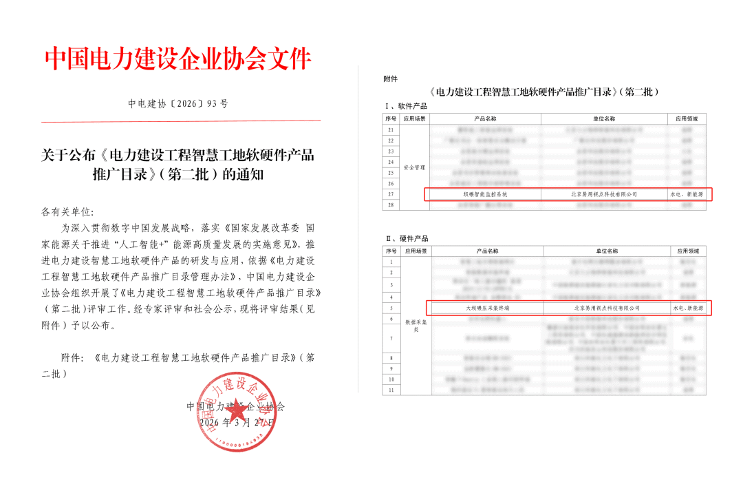 近日,中国电力(HK2380)建设企业协会发布《电力建设工程智慧工地软硬件产品推广目录》(第二批),广哈通信(300711)控股子公司易用视点坝碾智能监控系统(软件产品)、大坝碾压采集终端(硬件产品)成功入选,成为电力建设智慧工地领域的推荐产品,公司创新能力及产品质量获行业权威认可。
