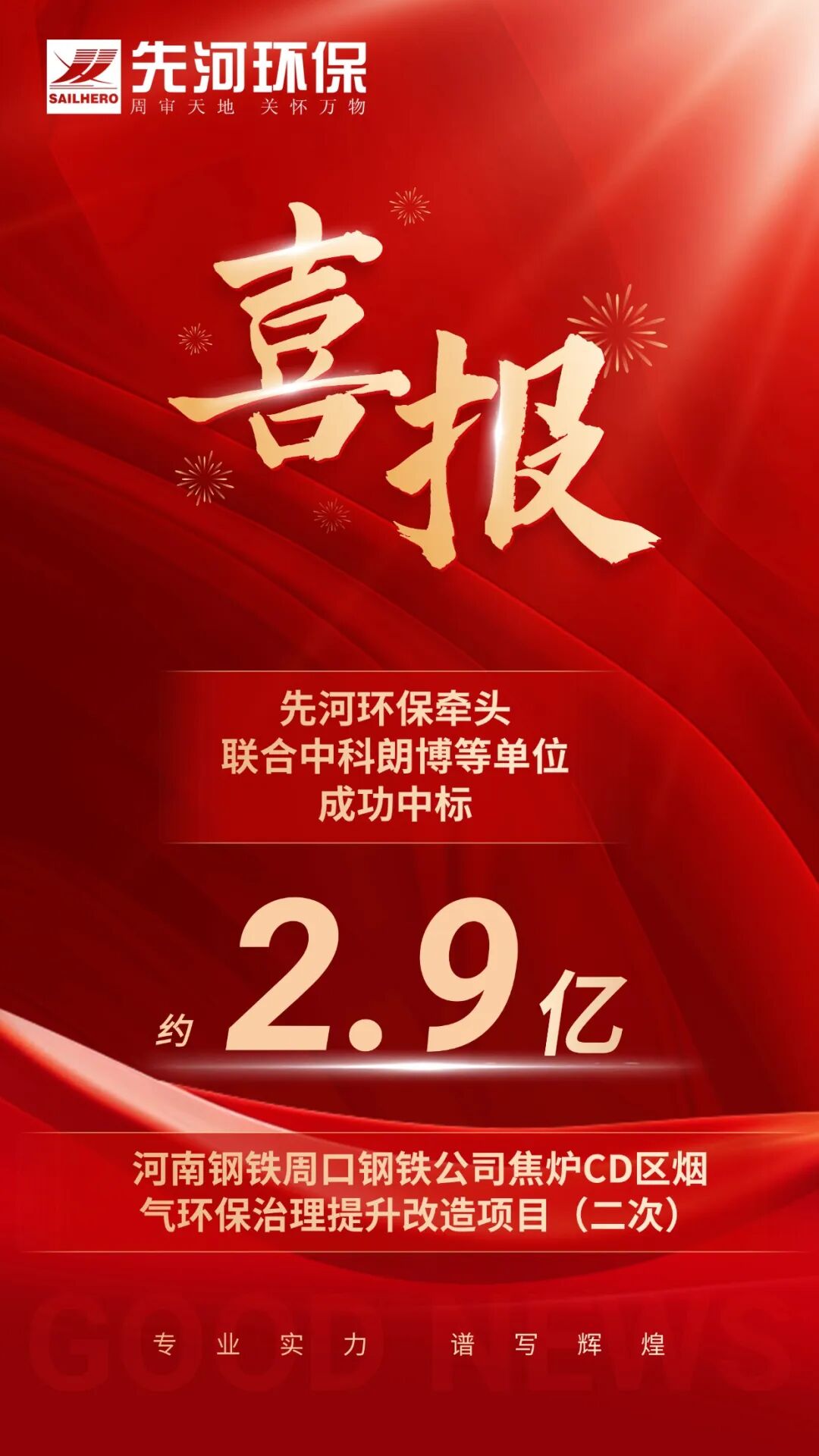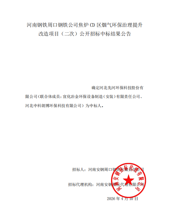 喜报传来,振奋人心!近日,由河北先河环保(300137)科技股份有限公司牵头,联合宣化冶金环保设备(881284)制造(安装)有限责任公司、河北中科朗博环保科技有限公司组成的联合体,凭借领先的技术方案、丰富的工程经验和极具竞争力的综合优势,成功中标河南钢铁(850106)周口钢铁(850106)公司焦炉CD区烟气环保治理提升改造项目(二次),中标金额达2.897亿元。