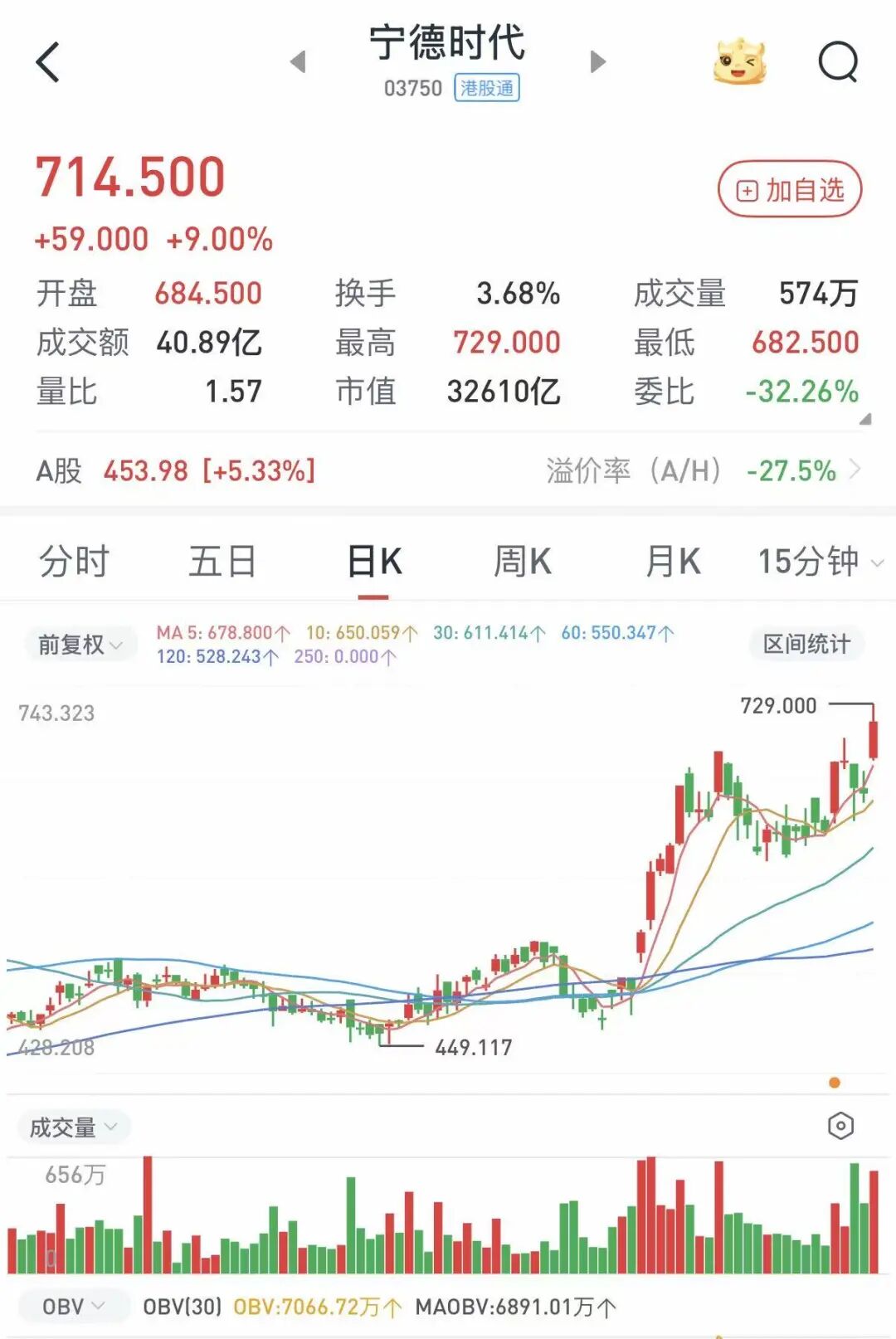 4月16日开盘,宁德时代(HK3750)股价即跳空高开。盘中,A股一度摸高至460元/股,涨幅超过6%,较上年同期近乎翻番;H股方面同样势如破竹,一度大涨超10%,上探至723港元/股。公司总市值随之刷新历史纪录,冲至约2.1万亿元人民币;截至收盘,A股报453.98元,涨幅5.33%;H股报714.5港元,大涨9%。