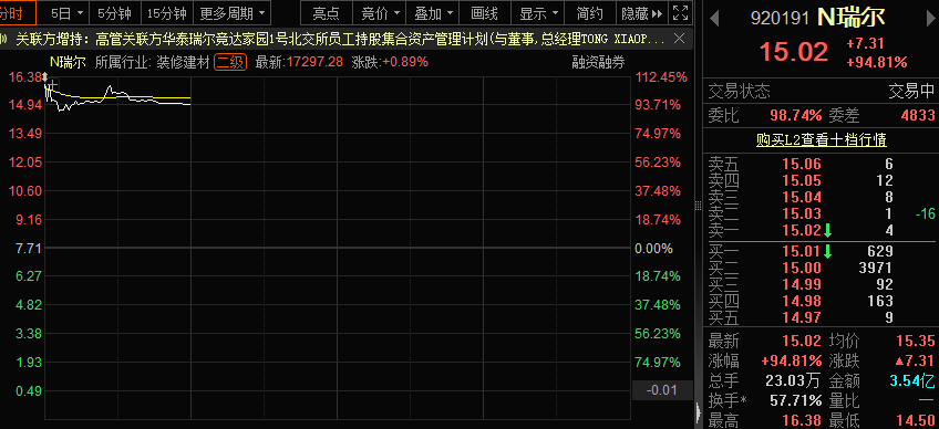 N瑞尔(920191)今日在北交所上市,开盘价15.99元,上涨107.39%。公司是一家专业为高炉炼铁系统提供长寿技术方案及关键耐火材料(884063)的高新技术企业,主要从事炼铁高炉高效、长寿、节能、绿色、环保等技术与所需耐火材料(884063)的研发、生产和销售。