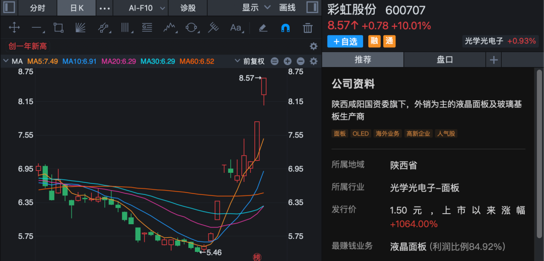 消费电子(881124)早间整体走强,折叠屏(885809)方向最为活跃,板块指数放量创历史新高(883911)彩虹股份(600707)开盘仅约1分钟直线涨停,近8个交易日4度涨停;沃格光电(603773)约2分钟涨停,8日5板,乔锋智能(301603)西部材料(002149)等涨停或涨超10%。