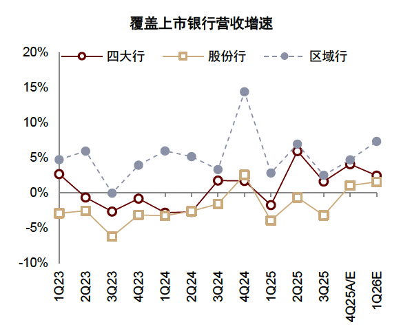图表:我们预计四大行/覆盖股份行/覆盖区域行1Q26单季营收分别同比+2%/+2%/+7%