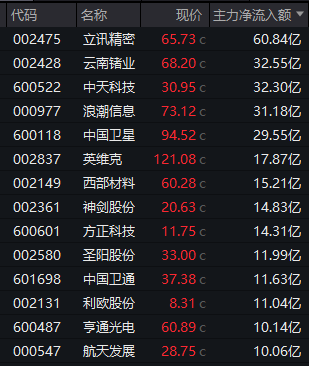 个股方面,立讯精密(002475)获得逾60亿元主力资金净流入,云南锗业(002428)、中天科技(600522)、浪潮信息(000977)获得超30亿元净流入,中国卫星(600118)获得逾29亿元净流入,英维克(002837)、西部材料(002149)等多股也都获得超10亿元净流入。