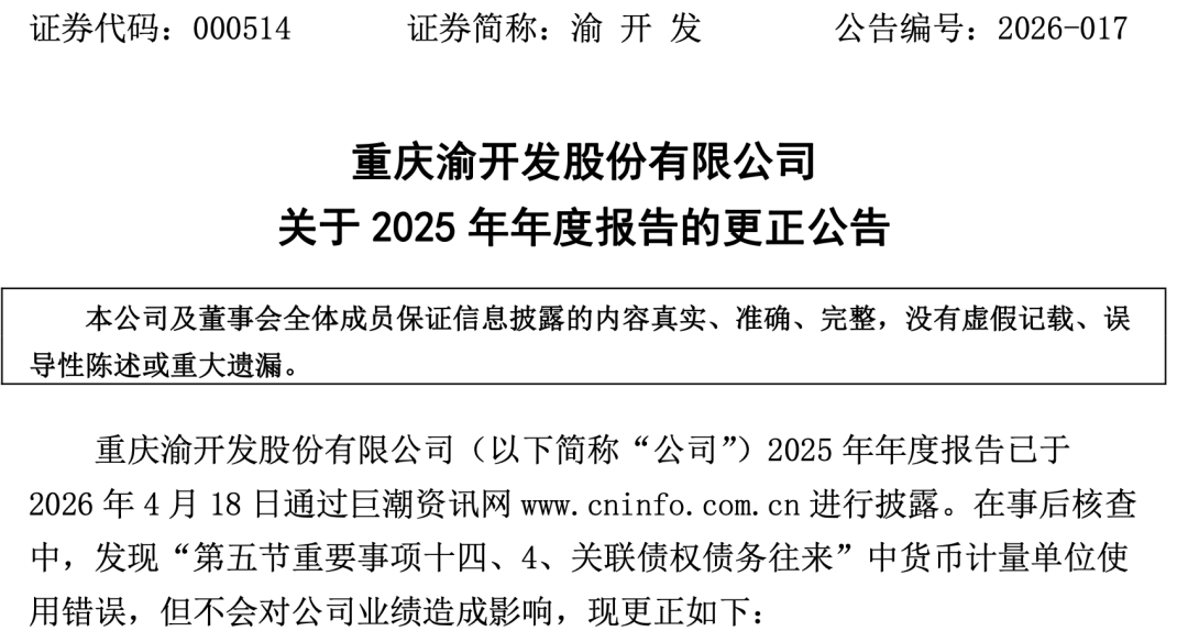 4月20日,重庆老牌房企渝开发发布一则更正公告,为其2025年年度报告中的错误致歉。