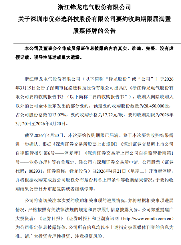 4月20日,锋龙股份(002931)公告,深圳市优必选(HK9880)科技股份有限公司的要约收购期限已于2026年4月20日届满。本次预定要约收购股份数量为2845万股,占公司股份总数的13.02%,收购价格为17.72元/股,要约收购期限为2026年3月20日至2026年4月20日。由于需进一步确认要约收购结果,公司股票自2026年4月21日开市起停牌。