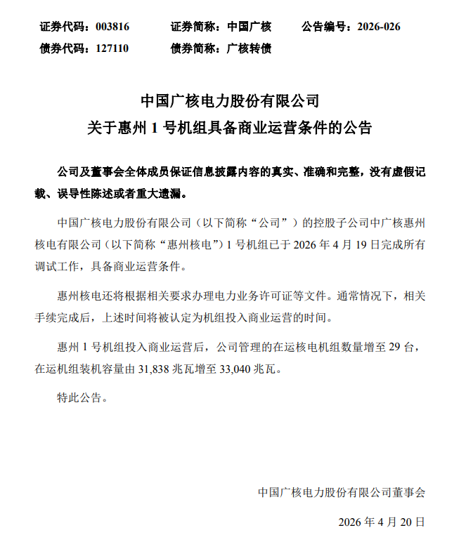 4月20日,中国广核(003816)公告称,公司控股子公司中广核惠州核电(885571)有限公司1号机组已于2026年4月19日完成所有调试工作,具备商业运营条件。后续将根据相关要求办理电力业务许可证等文件,手续完成后该时间将被认定为机组投入商业运营的时间。惠州1号机组投入商业运营后,公司管理的在运核电(885571)机组数量增至29台,在运机组装机容量由31,838兆瓦增至33,040兆瓦。